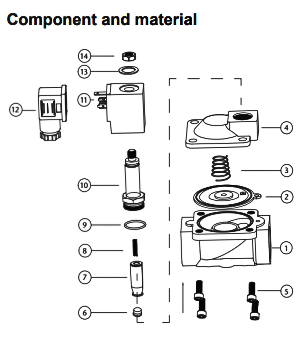 | 1. Thân van (Valve body) 2. Màng van (Diaphragm) 3. Lò xo màng (Diaphragm spring) 4. Nắp van (Valve cover) 5. Bu-lông (Bolt) 6. Gioăng pilot (Pilot seal) 7. Pilot 8. Lò xo pilot (Pilot spring) 9. O-ring 10. Cụm ống plunger (Plunger tube unit) 11. Cuộn coil (Coil) 12. Đầu cắm (Plug) 13. Vòng đệm (Washer) 14. Đai ốc khóa (Lock nut) |