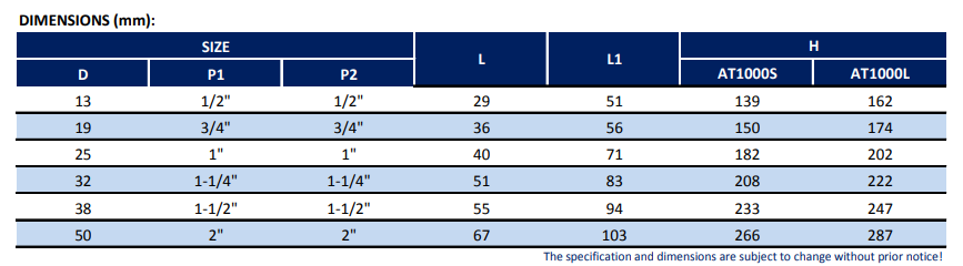 • Áp suất làm việc 0,3 đến 10bar, tùy chọn 11 đến 20bar