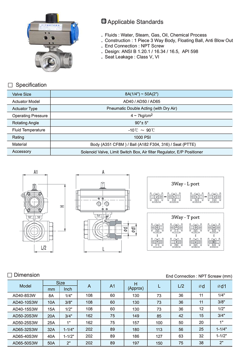 Van bi 3 mảnh điều khiển khí nén (single acting, lắp ren) - Automa