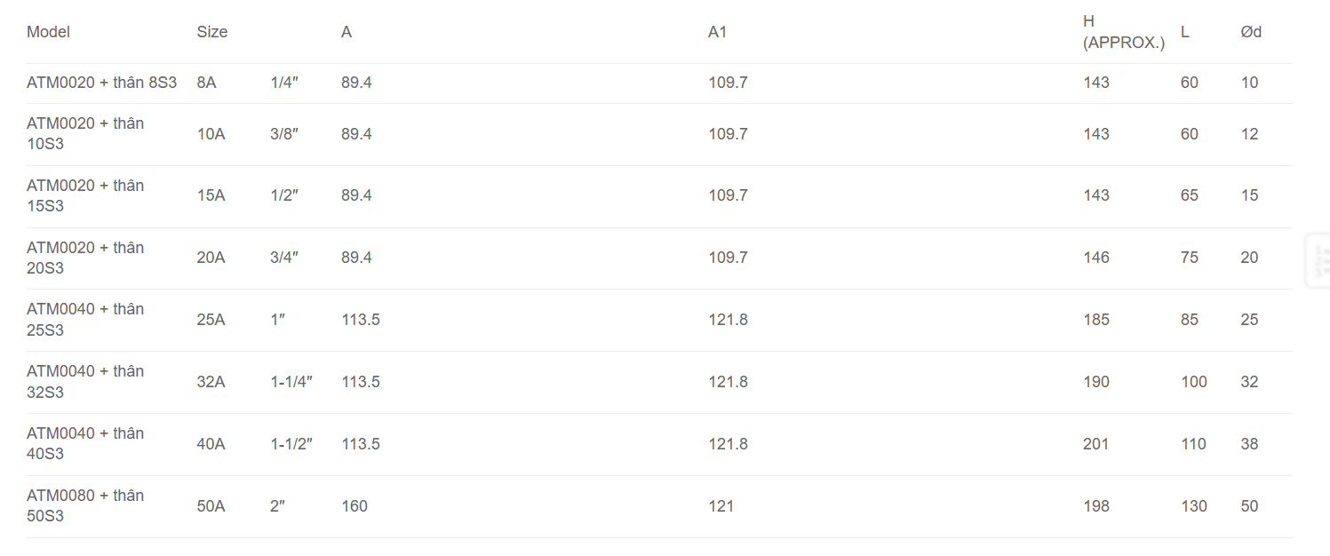 Kích thước van: 8A(1/4″) ~ 50A(2″)