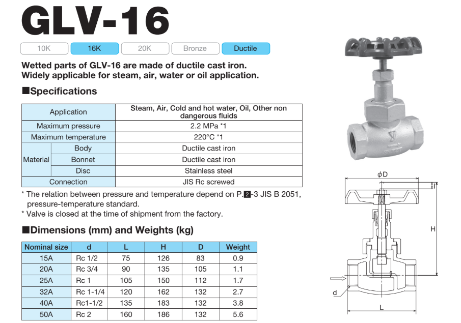 Chất liệu: Gang xám Kích thước: DN15 – DN50 Kết nối: Ren Áp suất tối đa: 22bar Nhiệt độ tối đa: 220ºC Ứng dụng Van cầu Yoshitake Model GLV-16: Hơi, Nước nước/ lạnh, Khí, Dầu